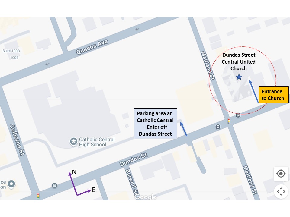 Parking is available at Catholic Central High School (the entrance to the parking lot is off Dundas Street west of Maitland Street) or on the streets around the church. (See the map above for location of the parking)